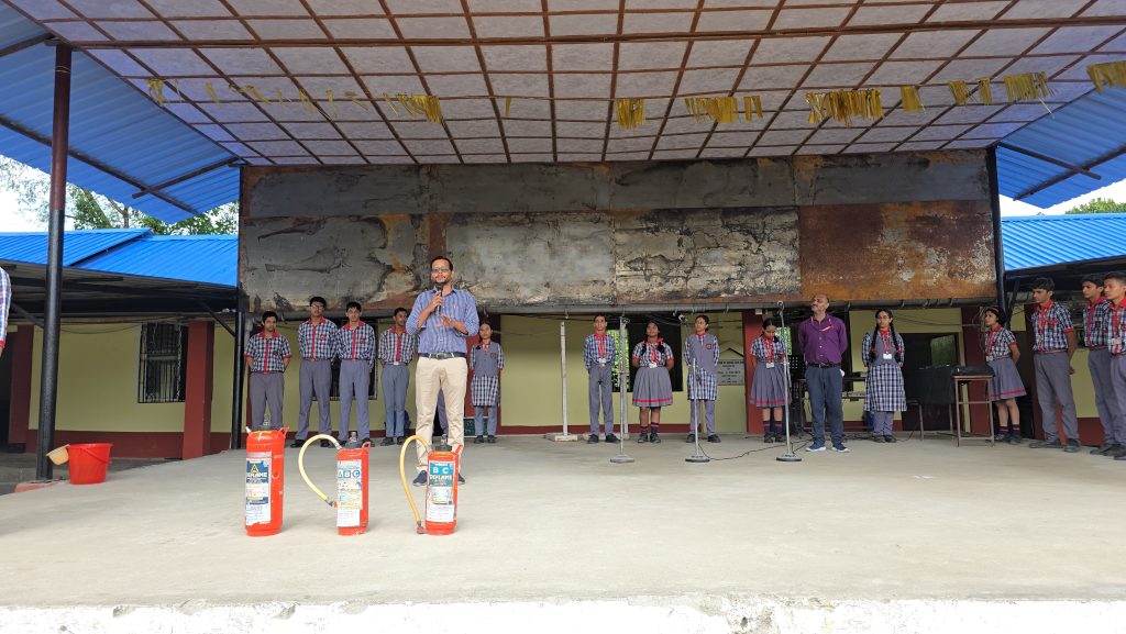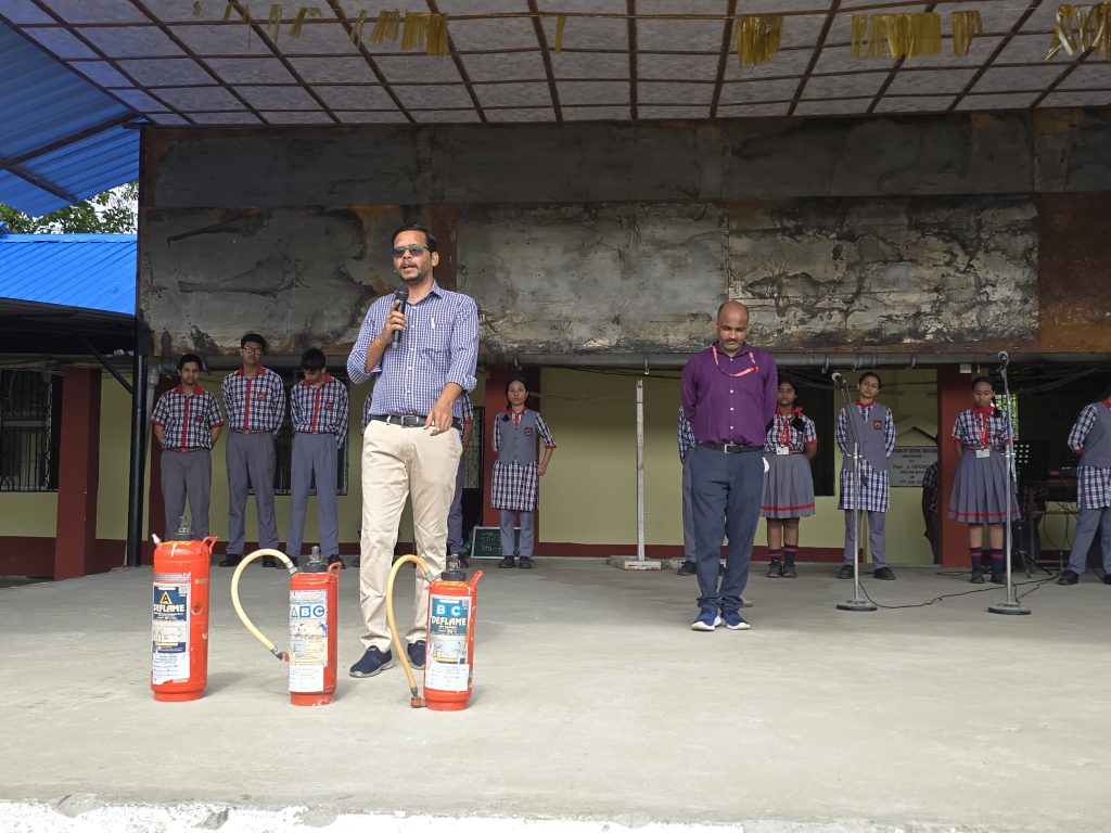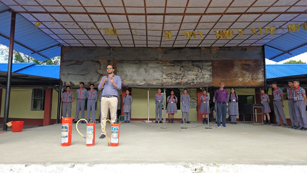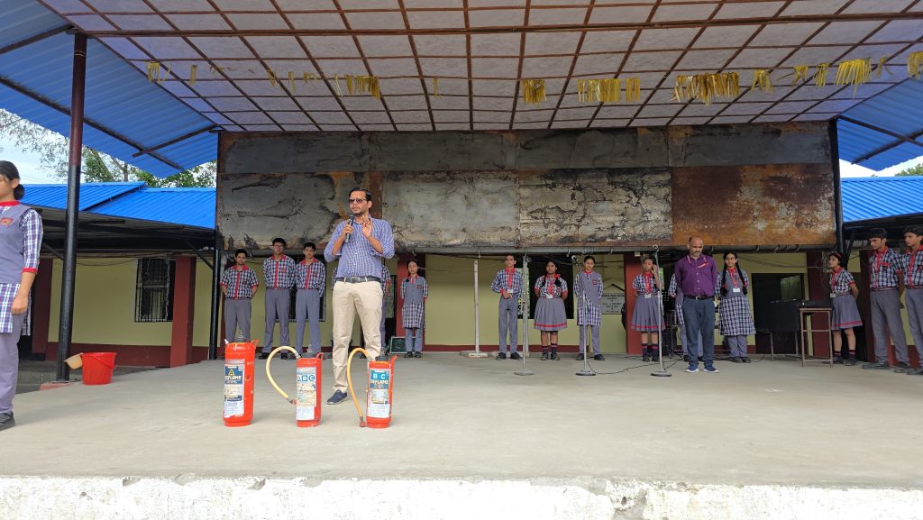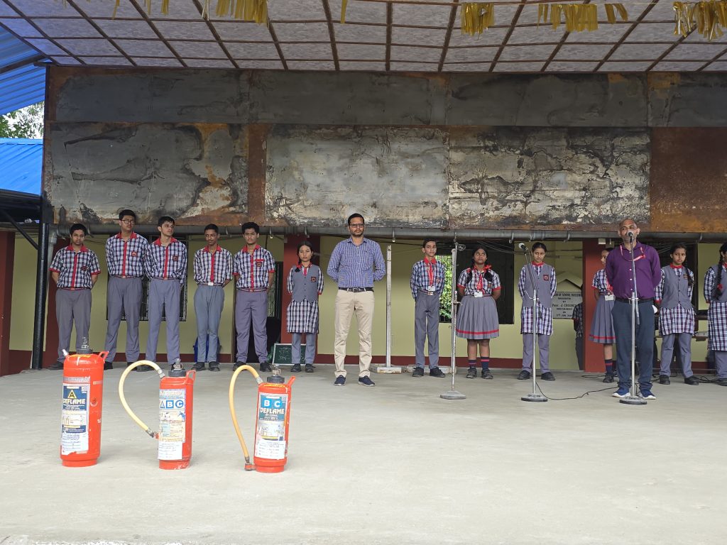As part of the practical demonstration, the TGT Work Education and PGT Chemistry teachers explained and demonstrated the proper use of fire extinguishers, highlighting their importance in handling emergency fire situations effectively. The drill enhanced awareness and preparedness among students and staff to respond calmly and responsibly during emergencies.
